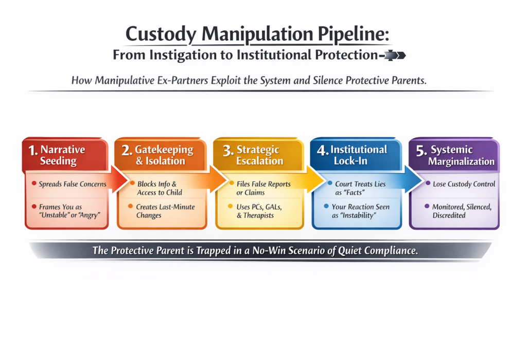 This guide reveals the unspoken operations behind family court systems that repeatedly empower abusive or manipulative actors, while pressuring protective parents to remain passive, polite, and compliant — a behavioral trap that enables the exact harm they are trying to stop.